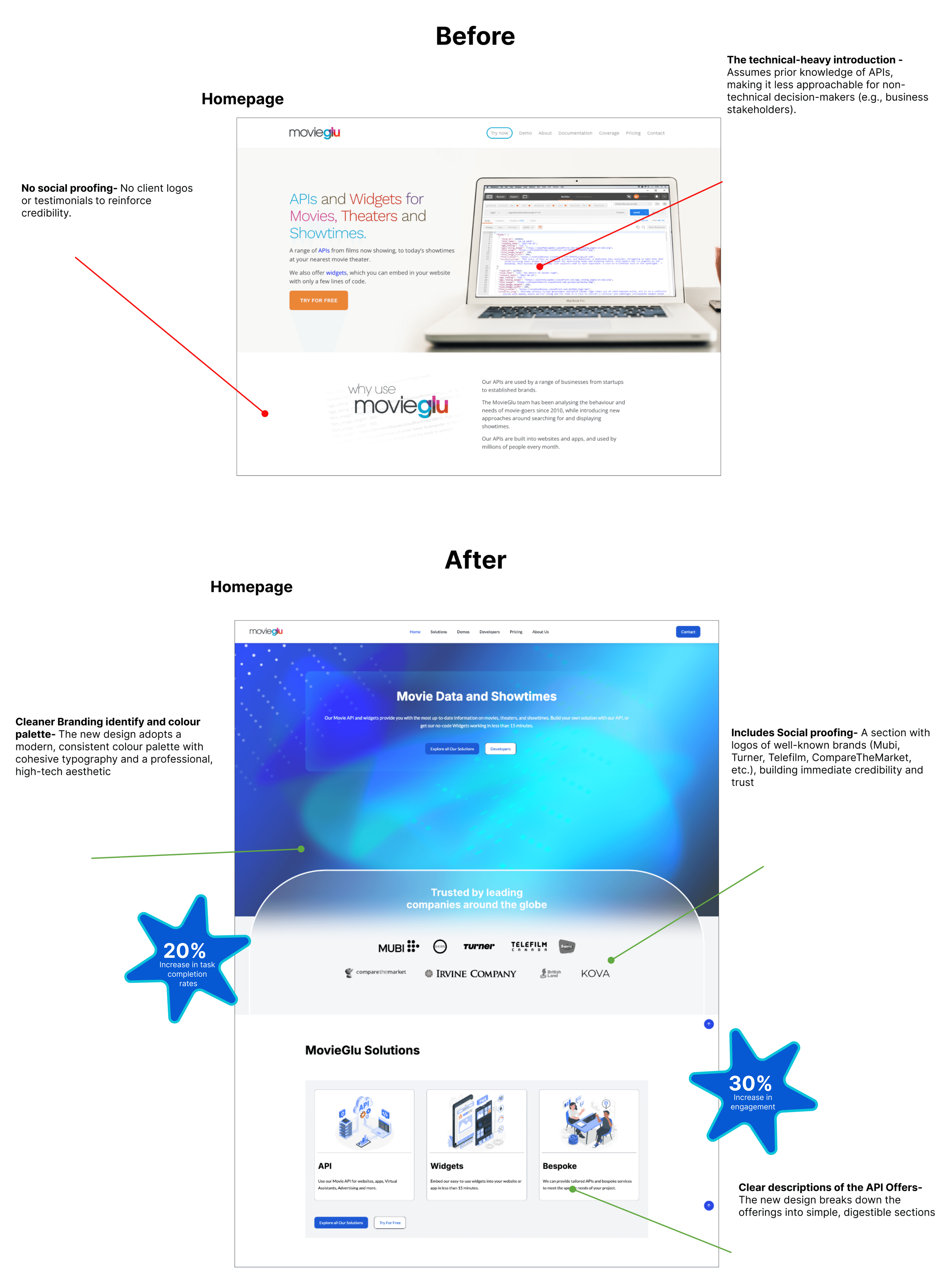 Ineffective Branding & Messaging ā The website wasnāt clearly communicating the value of MovieGluās APIs and services to potential B2B clients.
